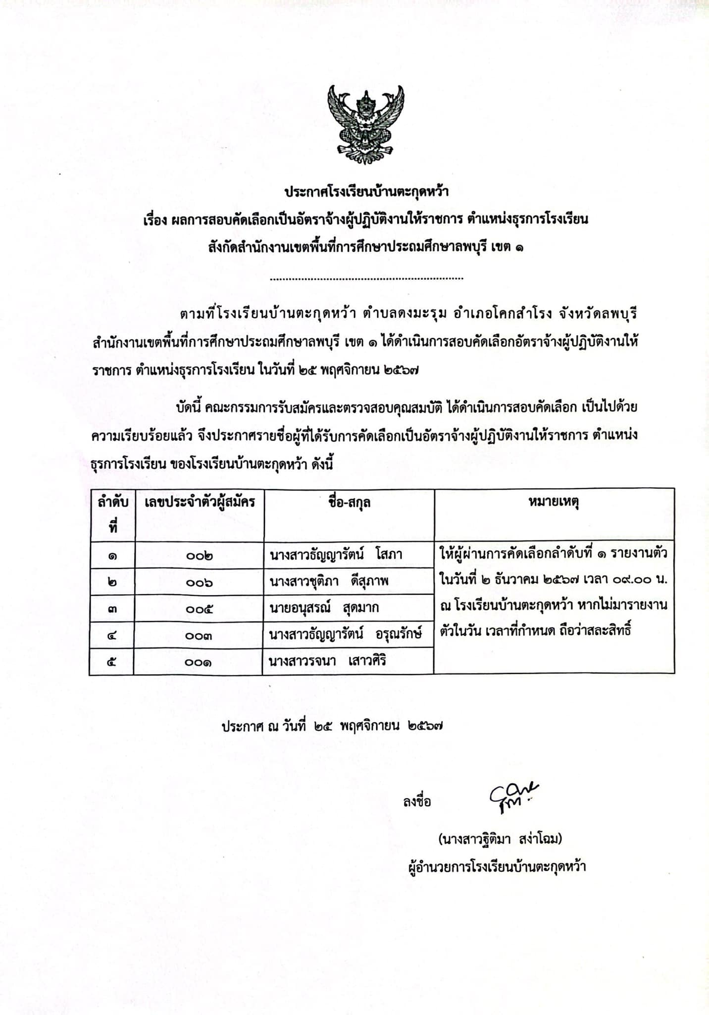 ประกาศผลสอบ คัดเลือกเป็นอัตราจ้างผู้ปฏิบัติงานให้ราชการตำแหน่งธุรการโรงเรียน