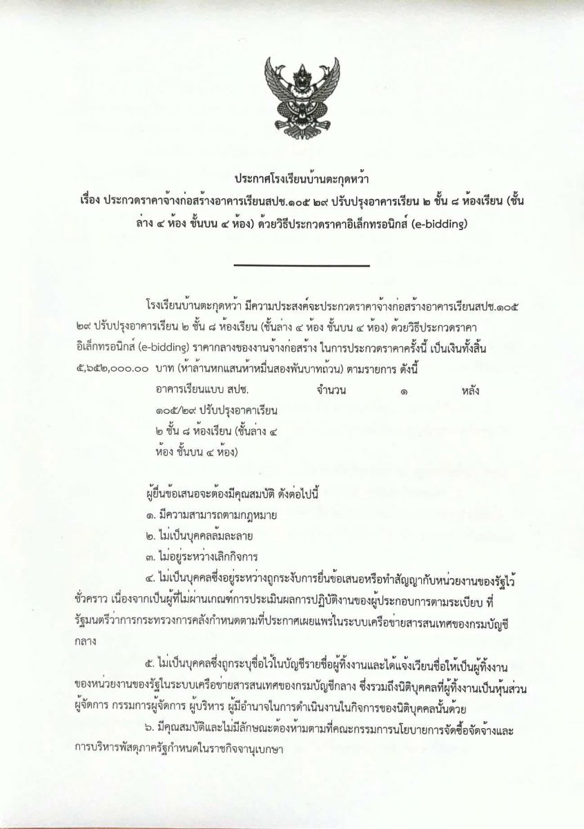 ประกวดราคาจ้างก่อสร้างอาคารเรียน สปช.105/29 ปรับปรุงอาคารเรียน 2 ชั้น 8 ห้องเรียน ด้วยวิธีประกวดราคาอิเล็กทรอนิกส์ (e-bidding)
